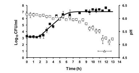图2、在最佳生长温度(62°C)下储存期间,源自炼乳(淡奶)中的孢子(■)和pH演变(□)的嗜热脂肪芽孢杆菌ATCC 7953细胞的生长动力学。黑色实线(?)描绘了Baranyi和Roberts模型对增长数据的拟合。白点(○)表示观察到的牛奶凝结时间。每个点是八个值的平均值。垂直和水平条表示标准偏差。