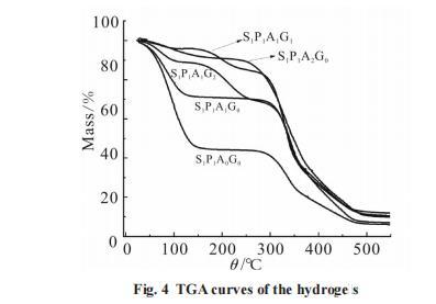 由Fig.4可知,水凝胶热分解过程如下:25~150℃为少量水分和小分子物质在加热过程中的蒸发和分解;280~450℃为质量损失第2阶段,主要是高分子链中不同侧基的断裂和分解,其中350℃左右分解速度最快;第3阶段为480℃以后质量趋于恒定。由于芦荟、甘油的添加增强了氢键等分子间相互作用,水凝胶的耐热性得以提高。当温度为200℃时,S1P1A1G0,S1P1A1G1和S1P1A1G2水凝胶对应的质量保留率分别为70.7%,90.7%和81.7%。当温度为300℃时,S1P1A0G0,S1P1A1G0和S1P1A2G0水凝胶对应的质量保留率分别为为42%,67.9%和77.5%。